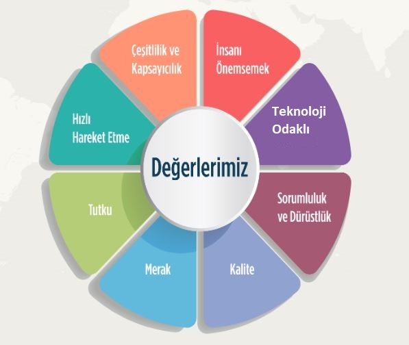 Deneyim, Sürekli Gelişim ve Değişim Hem yenilikçiliğe, gençliğe ve değişime, hem de deneyime önem vermek. İnsanlığın ve şirketimizin kültürel birikiminden yararlanarak ilerlemek. Dayanışma ve Paylaşım Ben değil, biz yaklaşımı. İyi ve kötü günde bir arada olmak. Bütünsel yaklaşım Sadece ağaçları değil ormanı görmek, sadece bir kesimi değil tüm kesimleri göz önüne almak Şeffaflık, Açıklık, Dürüstlük Bilgi ve izlenimlerini, istek ve içtenlikle, doğruluğunu bozmadan paylaşmak ve sözüne güvenilir olmak Karşılıklı saygı Her çalışanımız saygıdeğerdir. Adalet Hakkaniyet ve fırsat eşitliği Uzlaşma Anlaşamasak da, bir şekilde bir orta yol buluruz. Yenilikçilik ve Yaratıcılık Kalıplar içinde ,yeni fikirleri düşünen , denenmemişi dene ve faydalı değerler yaratır. Makul ve Gerçekçi Olmak Akılcı ve gerçekçi olmaya özen gösteririz. Gerçekleştirilemeyecek hayaller peşinde koşup emeğimizi ve zamanını ziyan etmemeye gayret gösteririz.