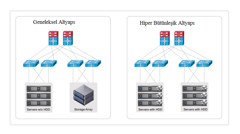 HCI, geleneksel donanım tabanlı sistemlerin tüm katmanlarını sanallaştıran, tamamen yazılım tabanlı bir altyapıdır. Bu mimari, sanallaştırılmış CPU, yazılım tanımlı depolama (VSAN) ve yazılım tanımlı ağ (Software-Defined Networking - SDN) bileşenlerini içerir. Kısacası, Hiper-Bütünleşik altyapılar, sunucu, veri depolama ve ağ katmanlarını standart x86 platformları kullanarak birleştirir ve sanallaştırır.